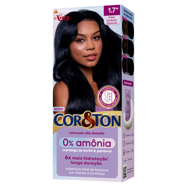 Composição: Coloração creme Cor&Ton: água, álcool cetearílico, hidróxido de amônio, ceteareth-25, cocamida mea, ácido estárico, ácido palmítico, 1-hidroxietilo 4, 5-diaminopirazolo sulfato, propileno glicol, 2,3-diaminodihidropira-zolopirazolona dimetossulfonato, 4-amino-2-hidroxitolueno, 5-cloroamino-6-cloroamino-6-0-cresol, ascorbic acid, sodium sulfite, sodium hydroxide, sodium lauryl sulfate, hydrolyzed wheat protein, hydroxyethoxy aminopyrazolopyridine hcl, hydrolyzed corn protein, hydrolyzed soy protein, phenoxyethanol, PEG-40/PPG-8-methylaminopro- pyl/hydroxypropyl dimethicone copolymer, ethylhexyl salicylate, polyquaternium-6, toluene-2, 5-diamine sulfate, isopropyl myristate, dipropylene glycol, myristic acid, cetrimonium chloride, tetrasodium EDTA, glycerin parfum/fragrance.