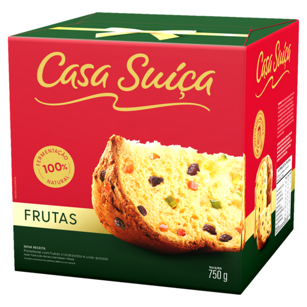 Ingredientes: Farinha de trigo enriquecida com ferro e ácido fólico, uvas-passas, açúcar, frutas cristalizadas, gordura vegetal (palma e soja), ovo líquido pasteurizado, gema de ovo pasteurizada, margarina, manteiga sem sal, glúten de trigo, açúcar invertido, leite em pó integral, sal, extrato de malte, emulsificantes mono e diglicerídeos de ácidos graxos e lecitina de soja, umectante glicerol, aromatizante, conservantes ácido sórbico e propionato de cálcio, corante beta-caroteno sintético.
