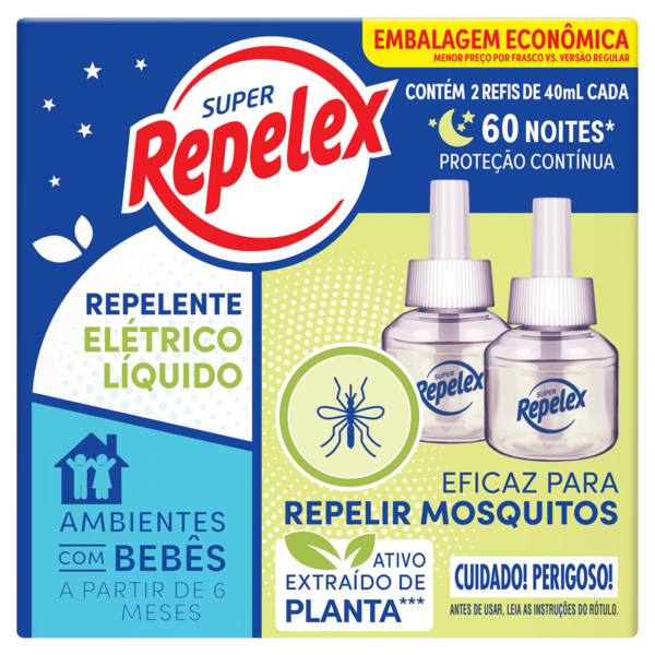 Repelente Líquido Elétrico 60 Noites Repelex Caixa 2 Unidades 40ml Cada Refil Embalagem Econômica