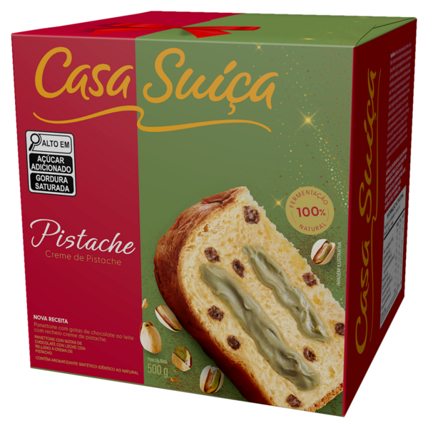 Ingredientes: Farinha de trigo enriquecida com ferro e ácido fólico, recheio creme de pistache (xarope de glicose, açúcar, água, pistache, gordura vegetal, leite em pó, soro de leite em pó, amido modificado, sal, estabilizantes sorbitol e glicerol, acidulante glucono-delta-lactona, emulsificantes lecitina de soja e mono e diglicerídeos de ácidos graxos, conservante sorbato de potássio, aromatizante, espessante alginato de sódio, regulador de acidez difosfato tetrassódico e corantes dióxido de titânio, clorofila cúprica e curcumina), açúcar, gordura vegetal, gotas de chocolate ao leite, ovo integral líquido pasteurizado, gema de ovo, glúten de trigo, manteiga sem sal, açúcar invertido, leite em pó integral, extrato de malte, sal, emulsificante mono e diglicerídeos de ácidos graxos e lecitina de soja, umectante glicerol, conservante propionato de cálcio, aromatizante, corante betacaroteno sintético.