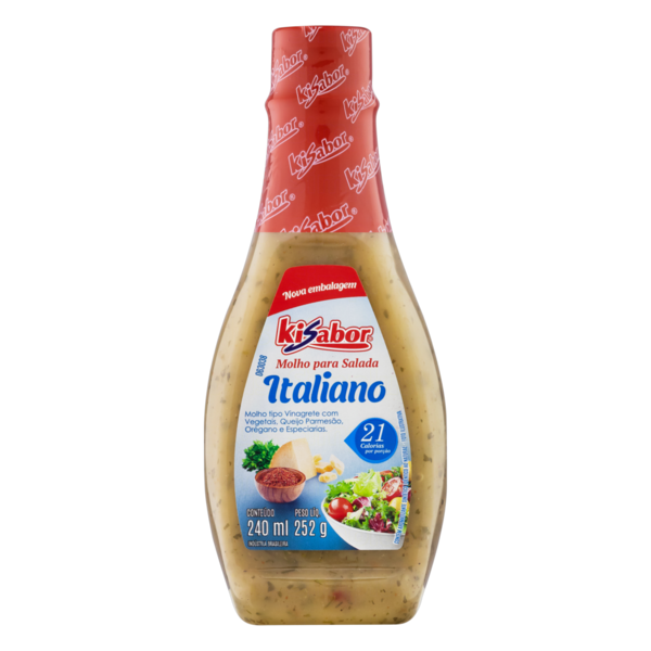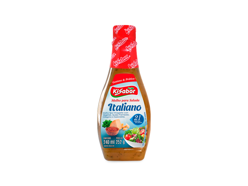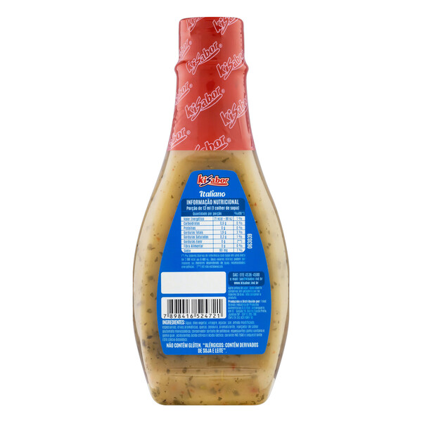Ingredientes: Água, óleo vegetal, vinagre, açúcar, sal, amido modificado, especiarias, ervas aromáticas, queijo, cenoura, aromatizante, realçador de sabor glutamato monossódico, conservador sorbato de potássio, espessantes goma xantana e goma guar, acidulantes ácido cítrico e ácido láctico, corantes INS 150d e sequestrante EDTA cálcio dissódico.
