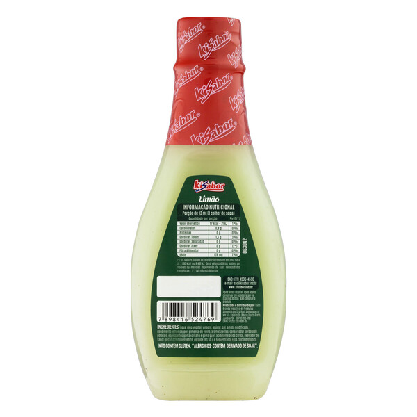 Porções por embalagem: Cerca de 18 • Porção: 13 ml (1 colher de sopa) Por 100 ml (13 ml, %VD*): Valor energético 124 kcal (16 kcal, 1%) • Carboidratos 5,1 g (0,7 g, 0%), dos quais: Açúcares totais 3,6 g (0,5 g), Açúcares adicionados 3,6 g (0,5 g, 1%) • Gorduras totais 12 g (1,6 g, 2%), das quais: Gorduras saturadas 1,9 g (0,2 g, 1%) • Sódio 918 mg (119 mg, 6%). Não contém quantidades significativas de Proteínas, Gorduras trans e Fibras alimentares. * Percentual de valores diários fornecidos pela porção.