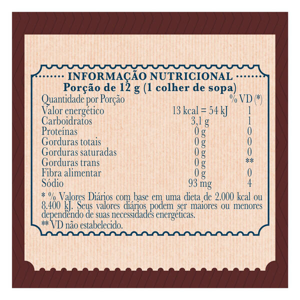 INGREDIENTES: ÁGUA, AÇÚCAR, TOMATE, VINAGRE, AMIDO MODIFICADO, SAL, POLPA DE PIMENTA, CORANTE CARAMELO IV, AROMATIZANTES E CONSERVADOR SORBATO DE POTÁSSIO.