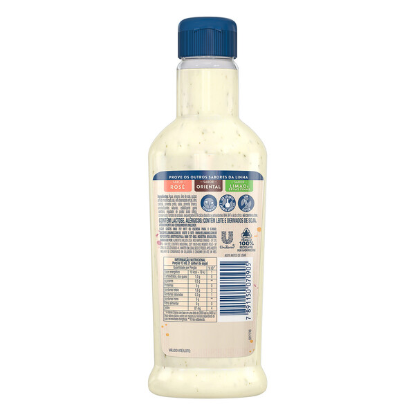 INGREDIENTES: ÁGUA, VINAGRE, ÓLEO DE SOJA, AÇÚCAR, AMIDO MODIFICADO, SAL, LEITE DESNATADO EM PÓ, ALHO, CEBOLA, PIMENTA-PRETA, SALSA, PIMENTA-BRANCA, AROMATIZANTES NATURAIS, ESTABILIZANTE GOMA XANTANA, REGULADOR DE ACIDEZ ÁCIDO CÍTRICO, CONSERVADOR SORBATO DE POTÁSSIO, SEQUESTRANTE EDTA CÁLCIO DISSÓDICO E ANTIOXIDANTES: BHA, BHT E ÁCIDO CÍTRICO.