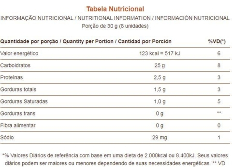*% Valores Diários de referência com base em uma dieta de 2.000kcal ou 8.400kJ. Seus valores diários podem ser maiores ou menores dependendo de suas necessidades energéticas. ** VD não estabelecido