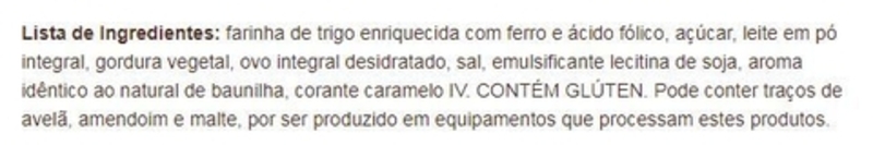 Lista de Ingredientes: farinha de trigo enriquecida com ferro e ácido fólico, açúcar, leite em pó integral, gordura vegetal, ovo integral desidratado, sal, emulsificante lecitina de soja, aroma idêntico ao natural de baunilha, corante caramelo IV. CONTÉM GLÚTEN. Pode conter traços de avelã, amendoim e malte, por ser produzido em equipamentos que processam estes produtos.