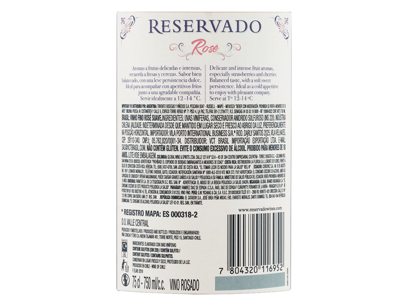 Ingredientes: Uvas viníferas, conservador anidrido sulfuroso (INS 220). Recomendações e Orientações: Evite o consumo excessivo de álcool. Advertência: Proibido para menores de 18 anos.