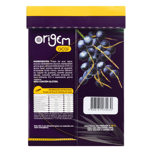 INGREDIENTES: POLPA DE AÇAÍ, ÁGUA, AÇÚCAR, ESTABILIZANTE (AÇÚCAR, ESPESSANTES GOMA GUAR, CARBOXIMETILCELULOSE (CMC) E GOMA TARA), EXTRATO NATURAL DE GUARANÁ, ACIDULANTE ÁCIDO CÍTRICO, AROMA IDÊNTICO AO NATURAL DE GUARANÁ, CORANTE (AÇÚCAR, GLICOSE, CORANTES ARTIFICIAIS AMARANTO E AZUL BRILHANTE FCF) E ESPESSANTE GOMA XANTANA.