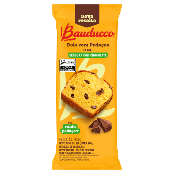 Ingredientes: Farinha de trigo enriquecida com ferro e ácido fólico, açúcar, óleo de canola, pedaços sabor chocolate meio amargo (açúcar, gordura vegetal, cacau em pó, emulsificante: lecitina de soja e aromatizante), ovo integral, amido modificado, ovo em pó integral, leite em pó integral, glucose, cenoura em pó, sal, fermentos químicos: difosfato dissódico, bicarbonato de sódio e di-hidrogenofosfato de cálcio, conservador: propionato de cálcio, emulsificante: mono e diglicerídeos de ácidos graxos, aromatizantes e corante sintético idêntico ao natural: betacaroteno.