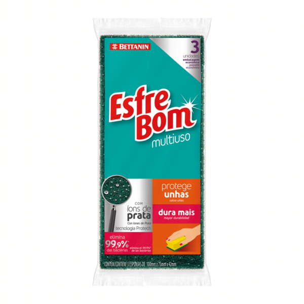 Esponja Multiuso Protege Unhas com Íons de Prata Esfrebom 3 Unidades Embalagem Econômica